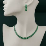 Aurelia brings a timeless charm through its rich emerald green stones set in a sleek silver-toned frame. The necklace follows a graceful, uniform silhouette featuring oval-cut stones that shine vividly against the skin. Paired with matching drop earrings crafted in the same clustered design, this set creates a polished and cohesive look.