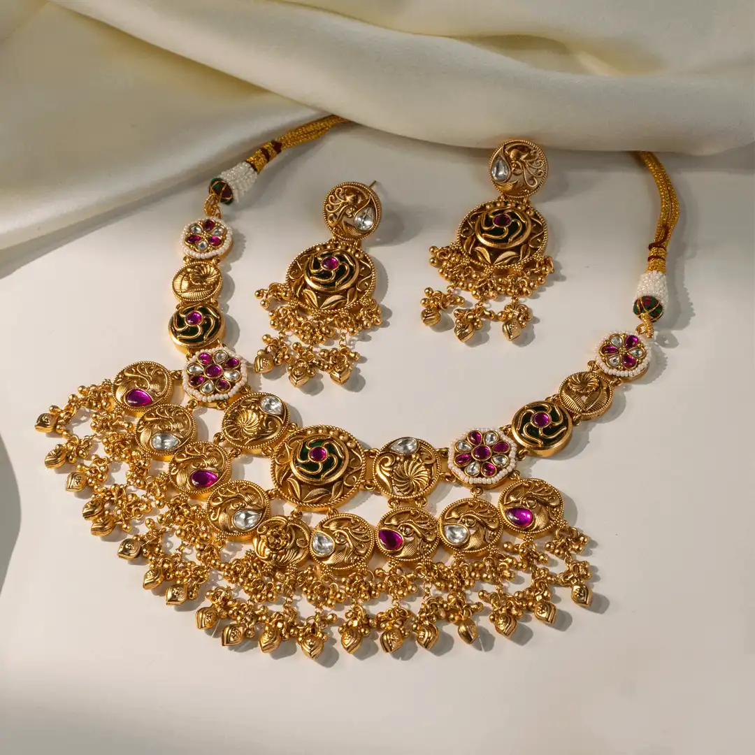 Devika is a richly detailed temple-style necklace set that celebrates traditional Indian craftsmanship with a regal presence. Crafted in an opulent gold-tone finish, the necklace features a sequence of intricately carved circular motifs inspired by classical temple art, highlighted with ruby-pink and emerald-green stone accents.