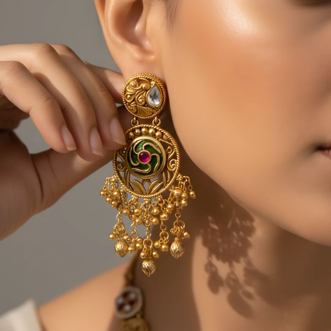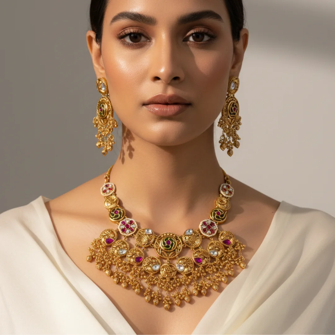 The design is further elevated with antique-style kundan-look stones and layered ghungroo-style drops that add movement, depth, and festive charm. A bold central motif anchors the necklace, while the cascading gold elements create a dramatic yet balanced silhouette around the neckline.