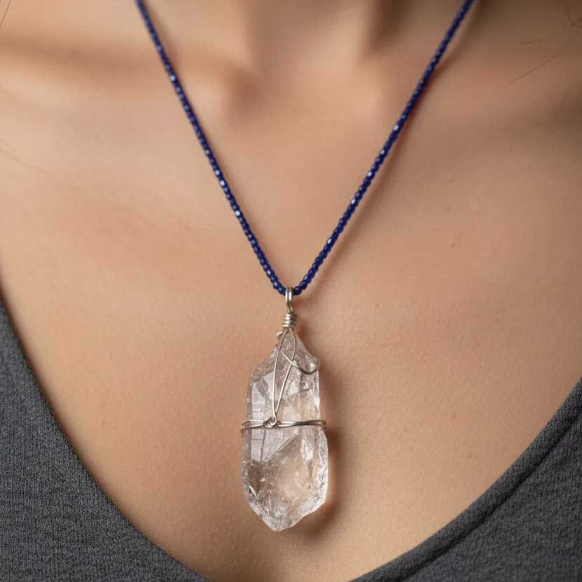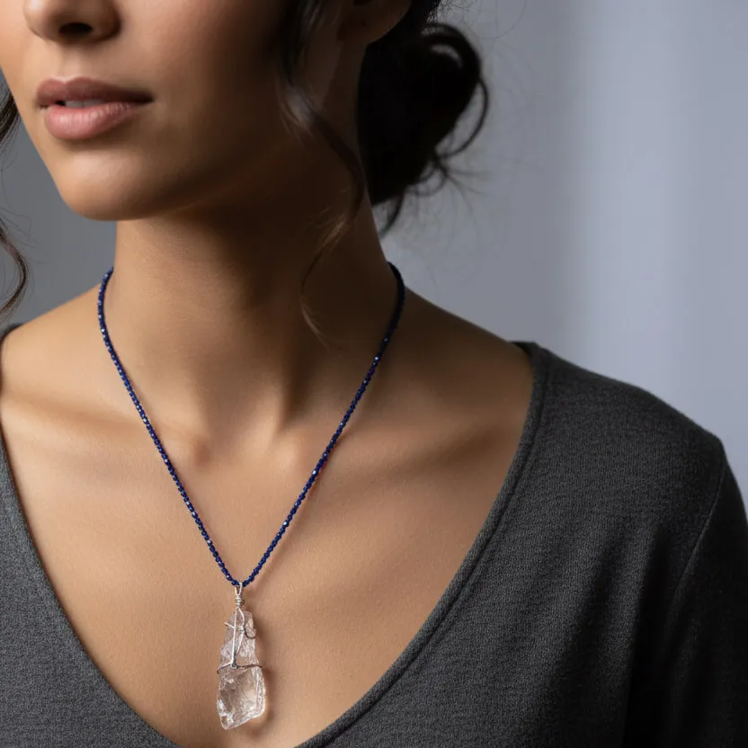 Elarin carries the raw clarity and calm energy of natural clear quartz. The pendant features an untouched, organically shaped quartz crystal wrapped in minimal silver-toned wire, letting the stone’s purity and light-reflecting facets stand out effortlessly. Paired with deep midnight-blue micro beads, the necklace brings a beautiful contrast of serenity and strength.