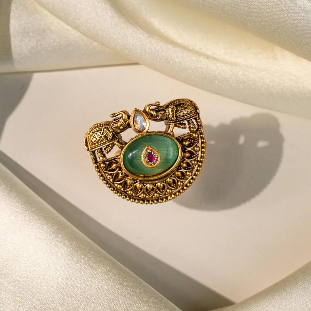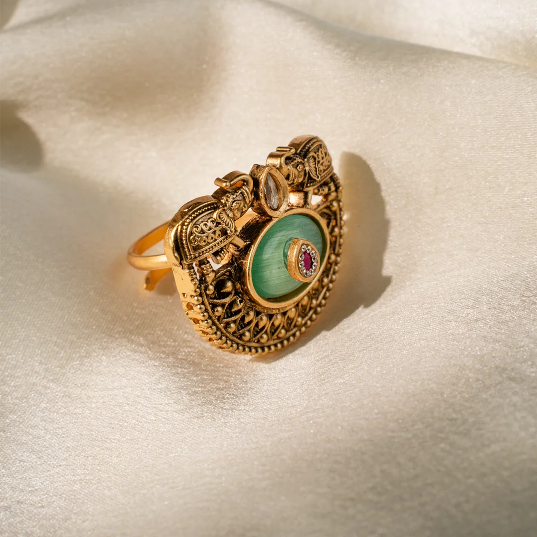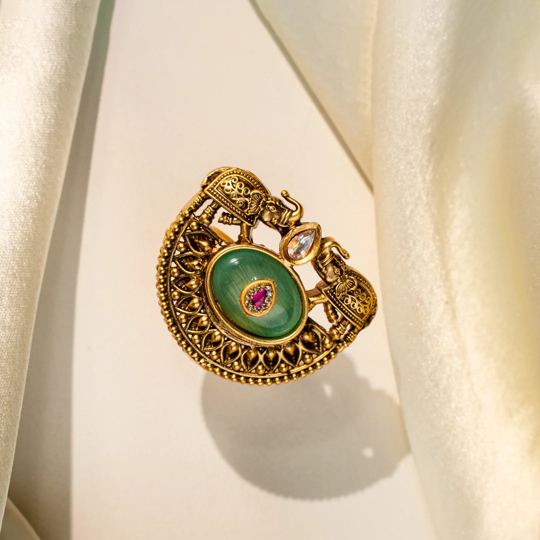 Gajraaj is a powerful tribute to traditional Indian symbolism, where artistry meets royal storytelling. This statement ring features a striking oval green stone at its center, highlighted with a delicate ruby pink accent encircled by subtle kundan detailing. The rich antique gold frame is adorned with intricate filigree patterns that enhance its vintage appeal.