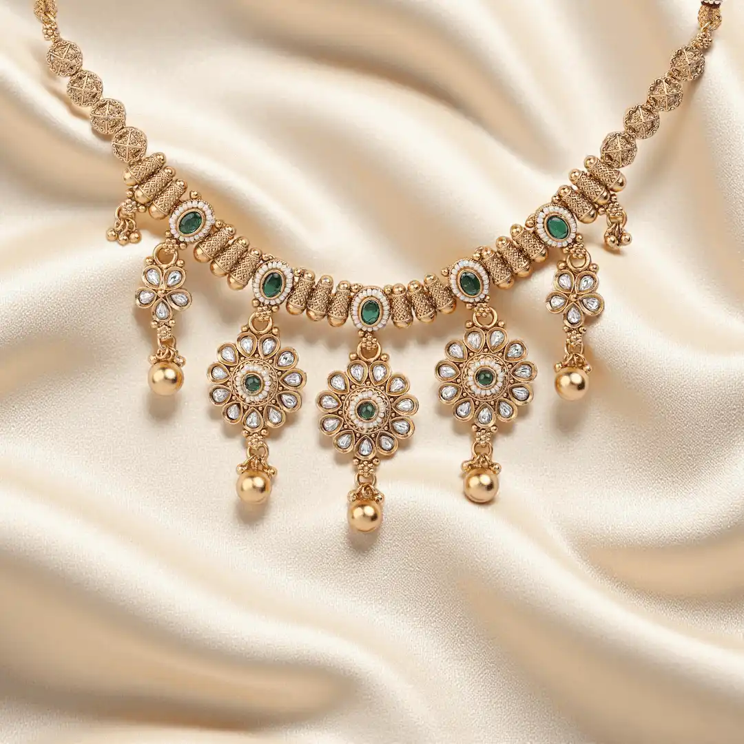 Indira blends classic temple motifs with rich emerald accents for a timeless ethnic statement. This gold-toned necklace set features intricate cylindrical beadwork along the neckline, oval green stone highlights, and floral drop pendants with mirror stone petals and golden ball danglers. Matching earrings complete the coordinated traditional look.
