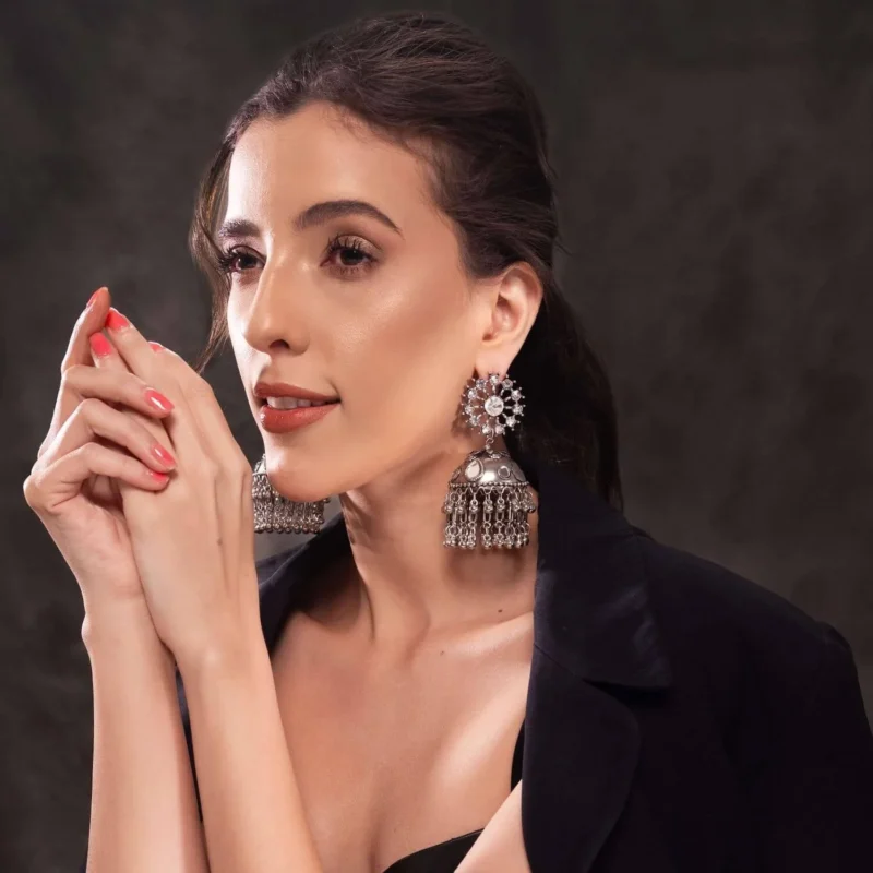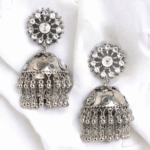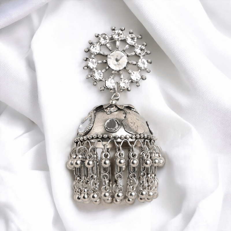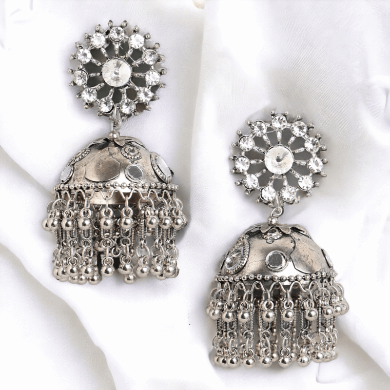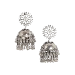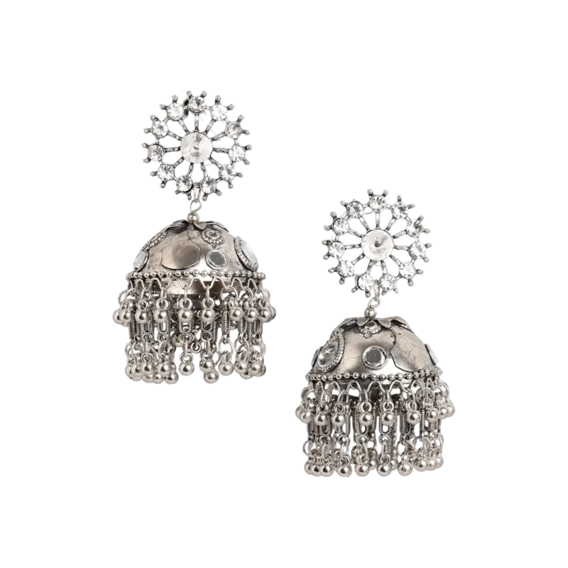 The jhumkas are adorned with stunning stone-studded details that reflect a subtle sparkle, creating a refined and sophisticated look. The oxidised silver base enhances the overall antique appeal, making these earrings a must-have for those who love vintage-inspired jewelry with a modern touch. The finely detailed patterns on the jhumka and the stone accents make these earrings stand out, ensuring that you turn heads wherever you go.