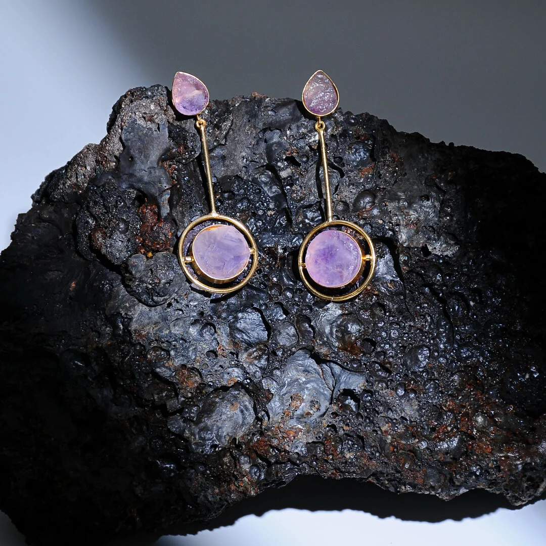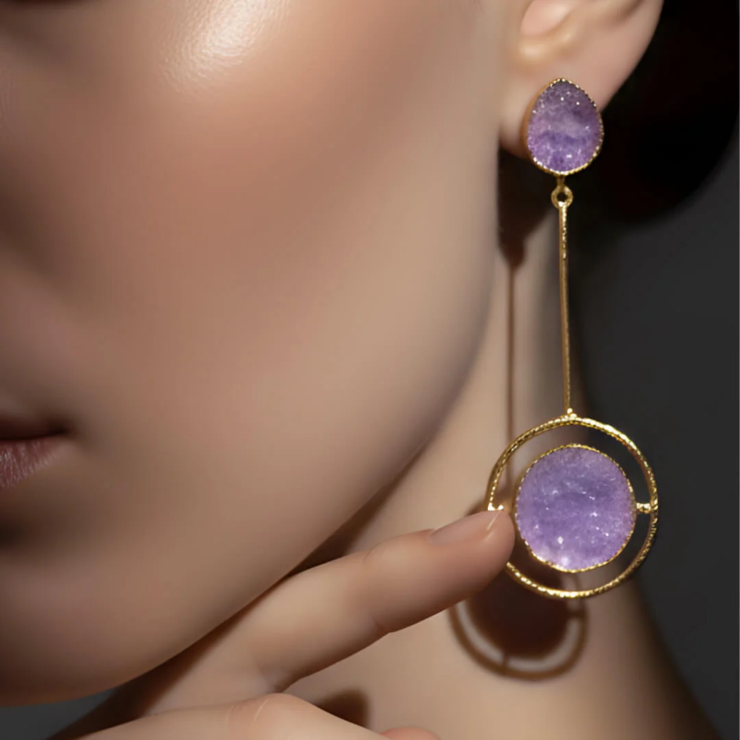 Lyra is a striking blend of raw gemstone beauty and modern, elongated elegance. At the top rests a teardrop-shaped uncut amethyst, glowing in its natural form. A sleek gold-plated bar extends downward, ending in a circular frame that holds a larger amethyst slice, giving the pair a celestial, orbit-like silhouette.