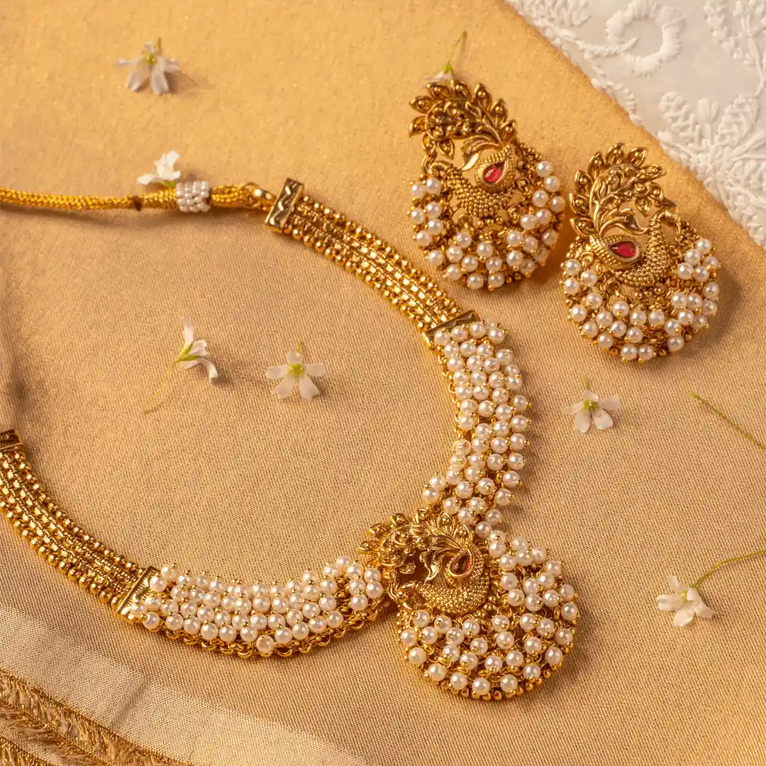 Mayurakshi is a regal temple-inspired necklace set that celebrates the timeless beauty of the peacock — a symbol of grace, divinity, and royalty. Crafted in a rich antique gold-tone finish, this statement piece blends intricate artistry with luminous pearl detailing for a truly heirloom-inspired look.