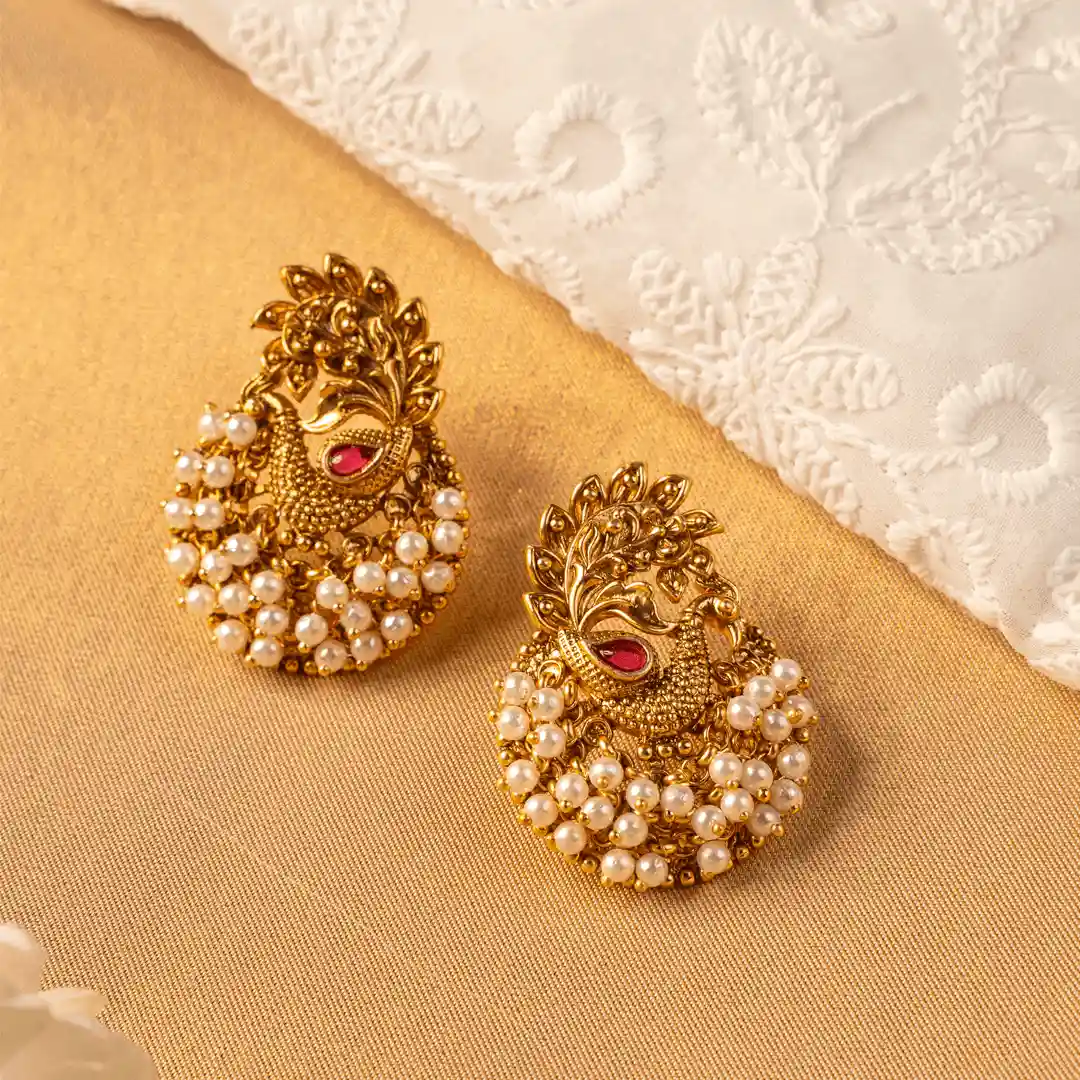 The matching earrings echo the same peacock design, beautifully detailed with pearl clusters and ruby-toned highlights, completing the set with balanced elegance and festive grandeur.