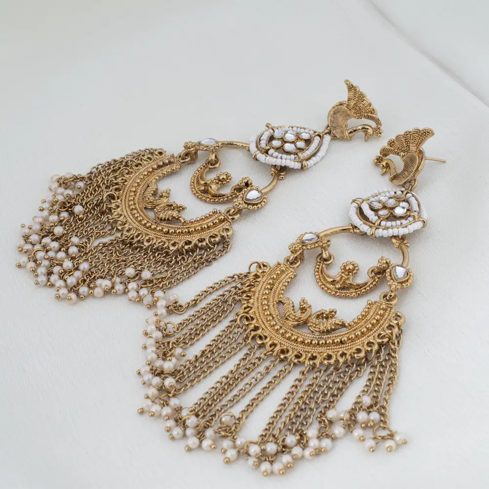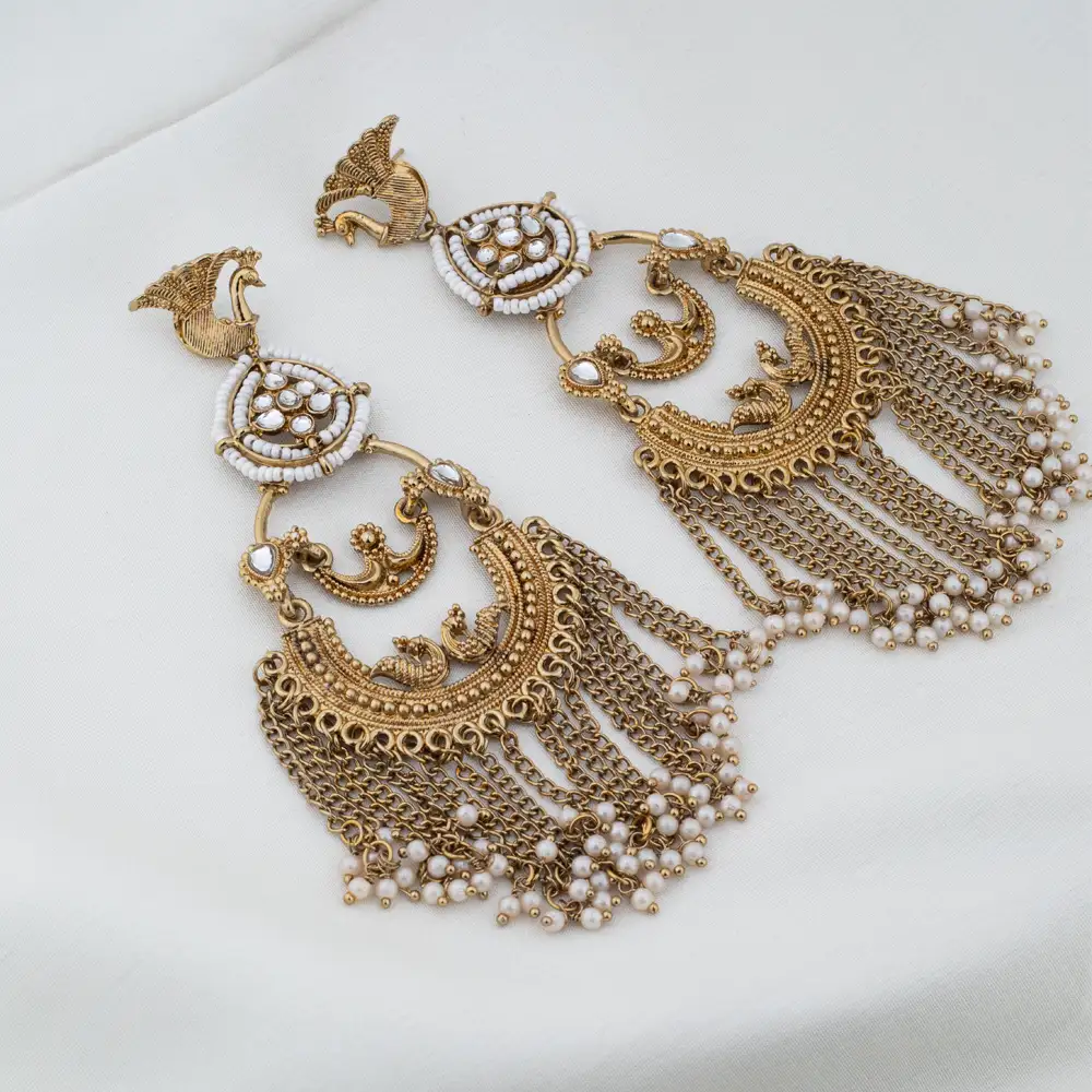 The lower half flows into dramatic layers of cascading antique gold chains, finished with clusters of pearl drops that add rhythm, fluidity, and graceful movement. The detailed carving and multi-layered structure give these chandbalis a royal presence, making them perfect for occasions where tradition meets statement styling.