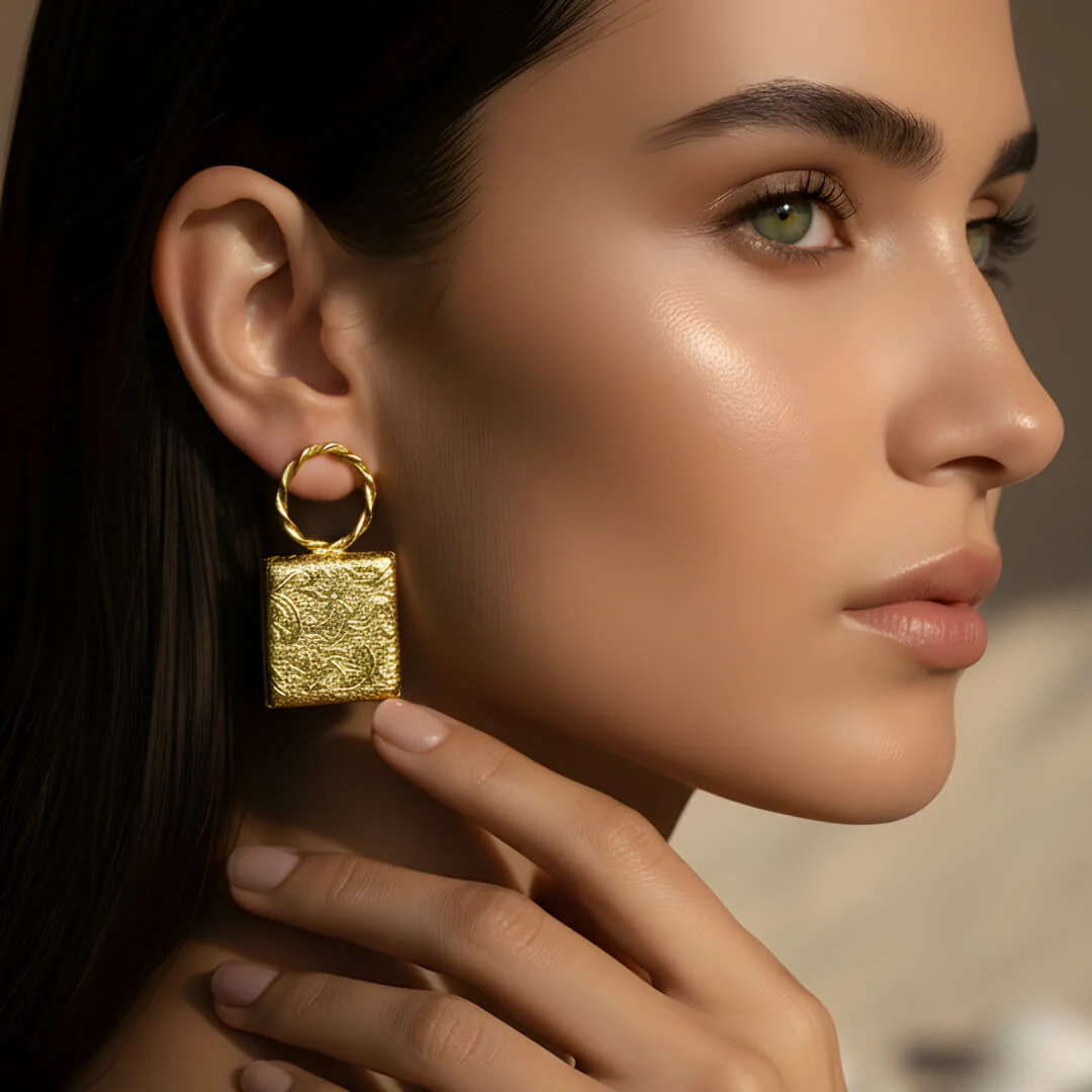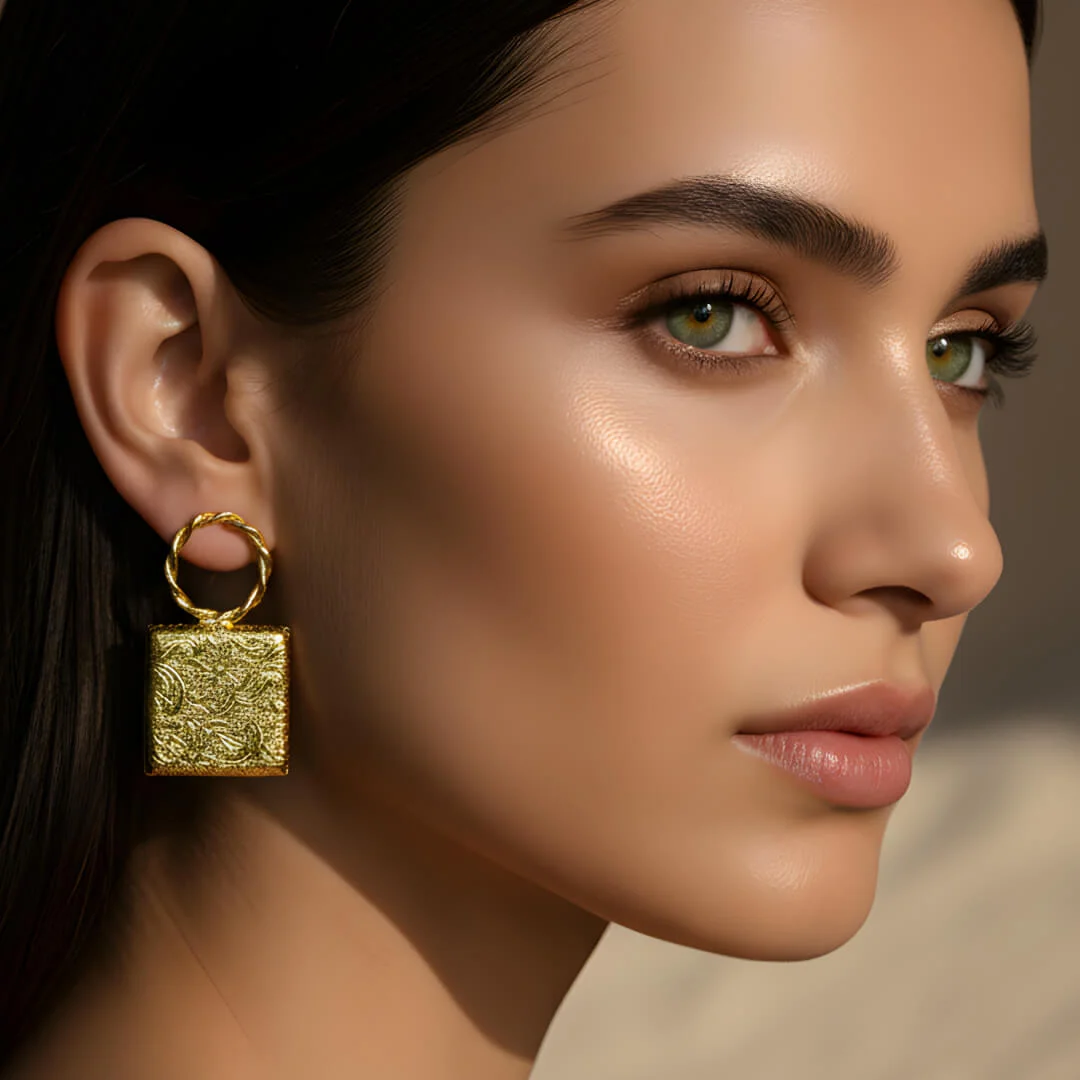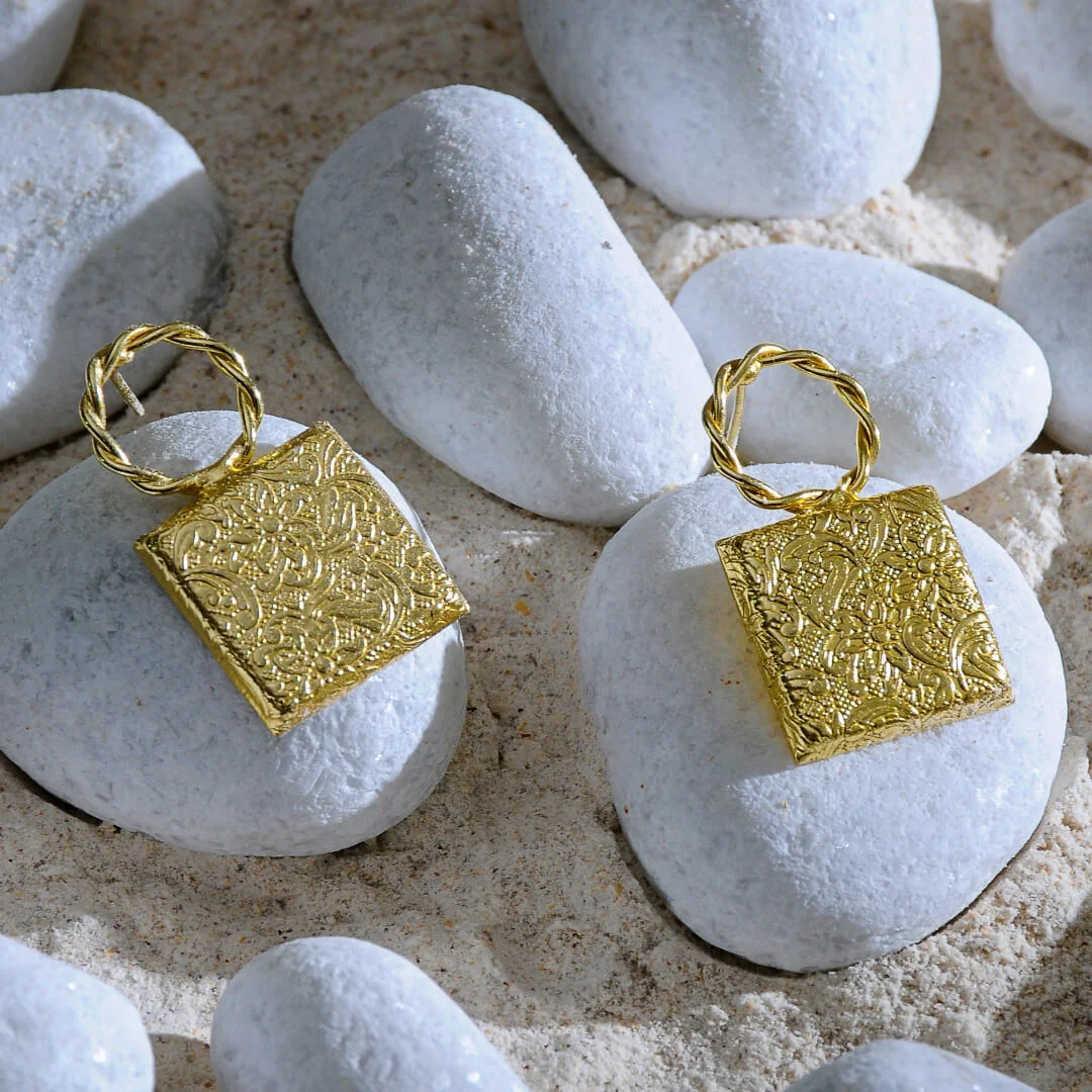 Meira embodies the confidence of clean lines and golden minimalism. Crafted in brass with a rich gold-plated finish, these earrings feature intricately textured square drops suspended from twisted hoops – a fusion of structure and softness. Lightweight yet striking, they add instant polish to any look.