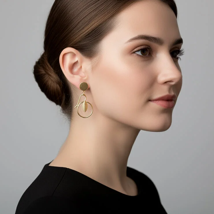 Mira brings together fluid curves and delicate detailing in a design that feels graceful and modern. The earring features a polished open loop, accented by a sculpted leaf-shaped charm with fine textured work. A brushed gold circular stud anchors the piece, adding a refined contrast to the organic drop below.