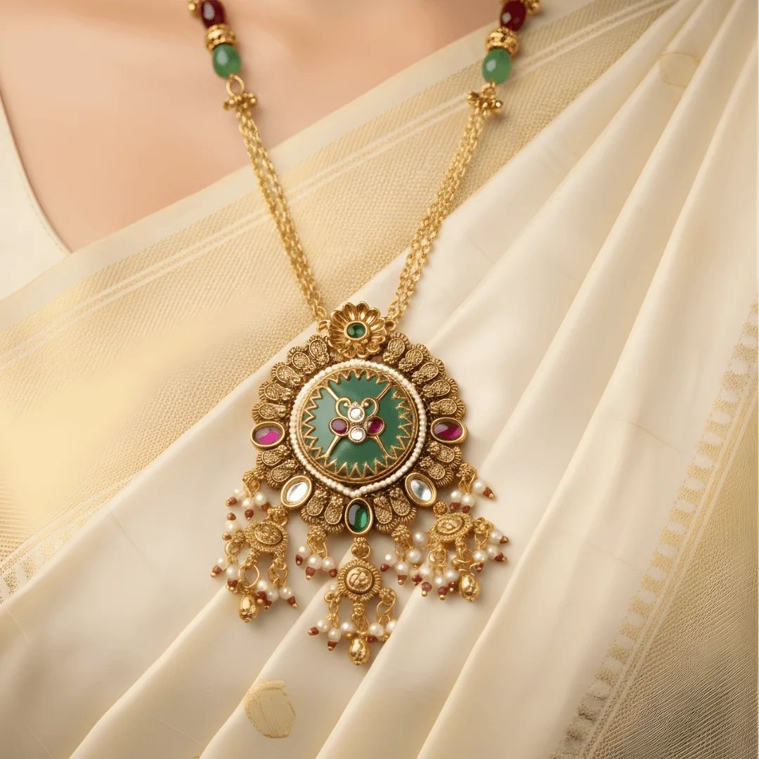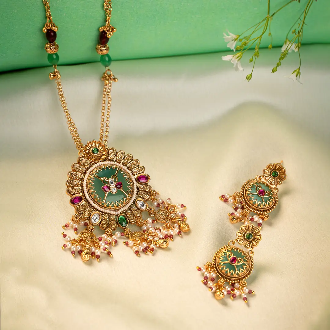Mrunmayee is a graceful blend of vibrant meenakari artistry and delicate festive detailing, designed in an elegant long pendant silhouette. This necklace features dual gold chains accented with green and ruby bead elements, leading to a striking circular pendant in rich green enamel. The centerpiece is highlighted with ruby pink and kundan style stone accents, framed with intricate gold beading that creates a radiant floral halo effect. Soft pearl and ruby bead danglers cascade from the lower edge, adding fluid movement and celebratory charm to the design.