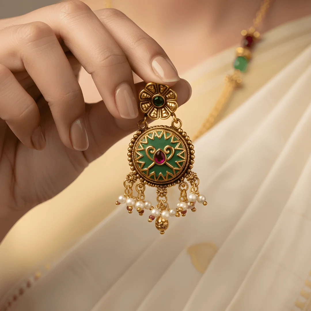 The matching earrings mirror the pendant’s circular meenakari motif, paired with floral tops set with green stones and finished with pearl and ruby bead clusters that enhance the festive appeal.