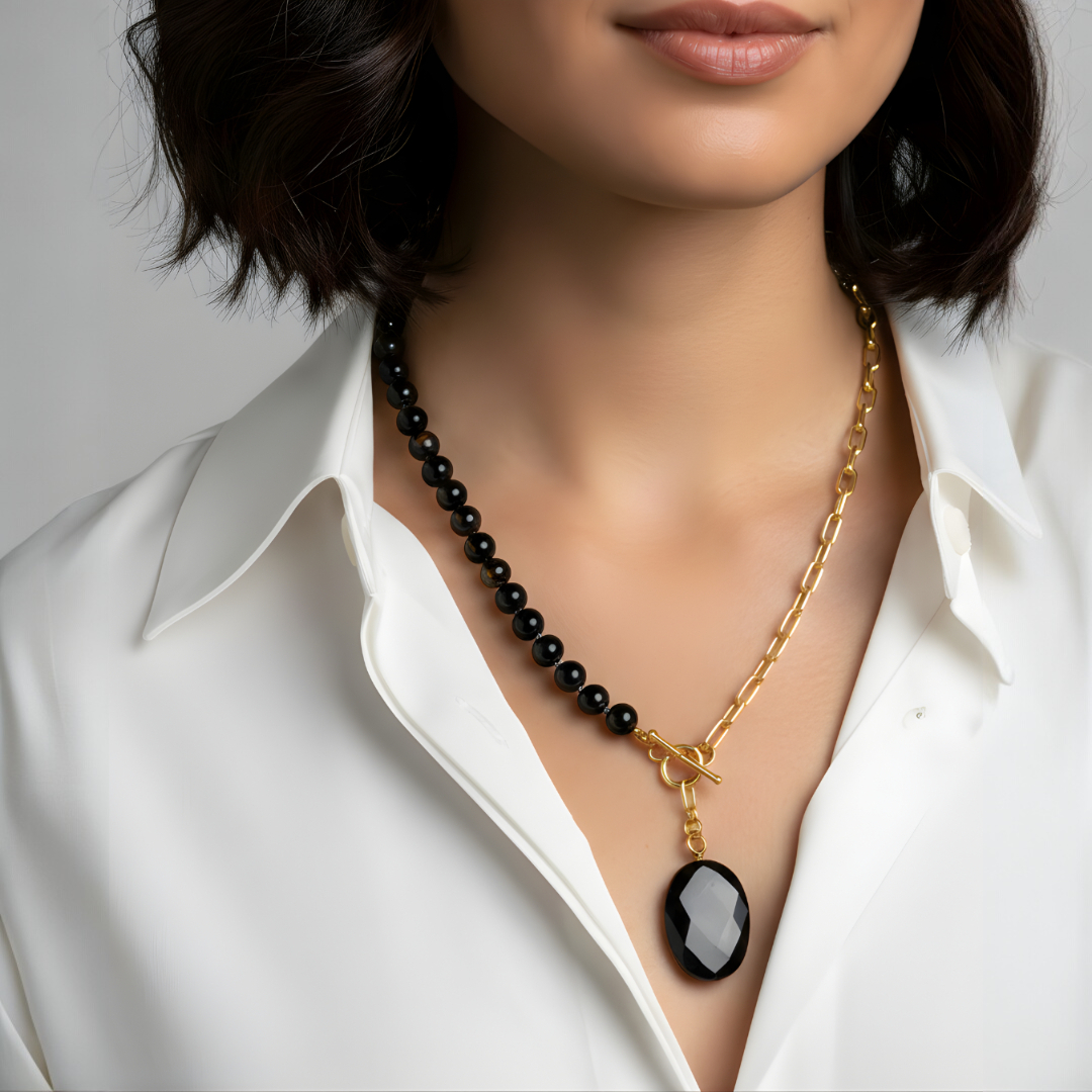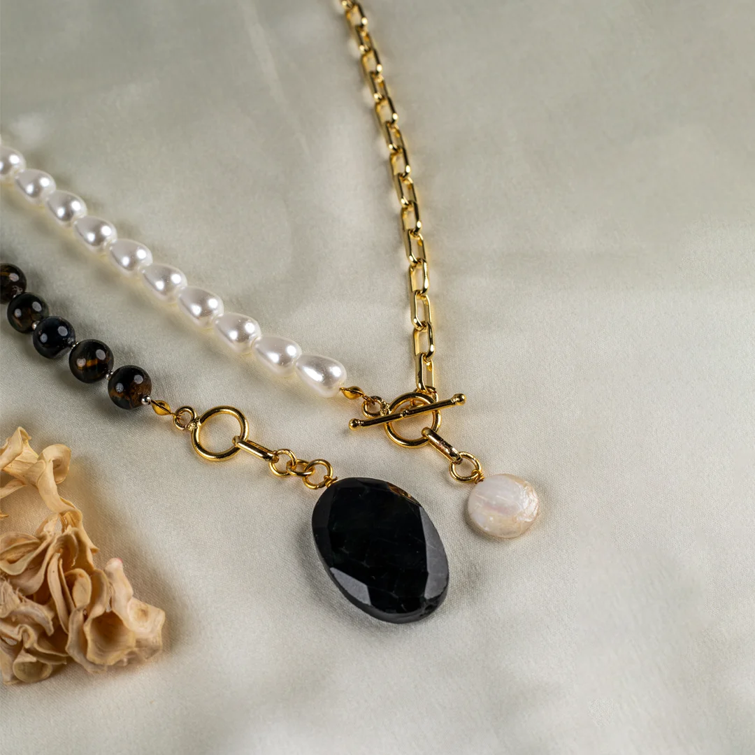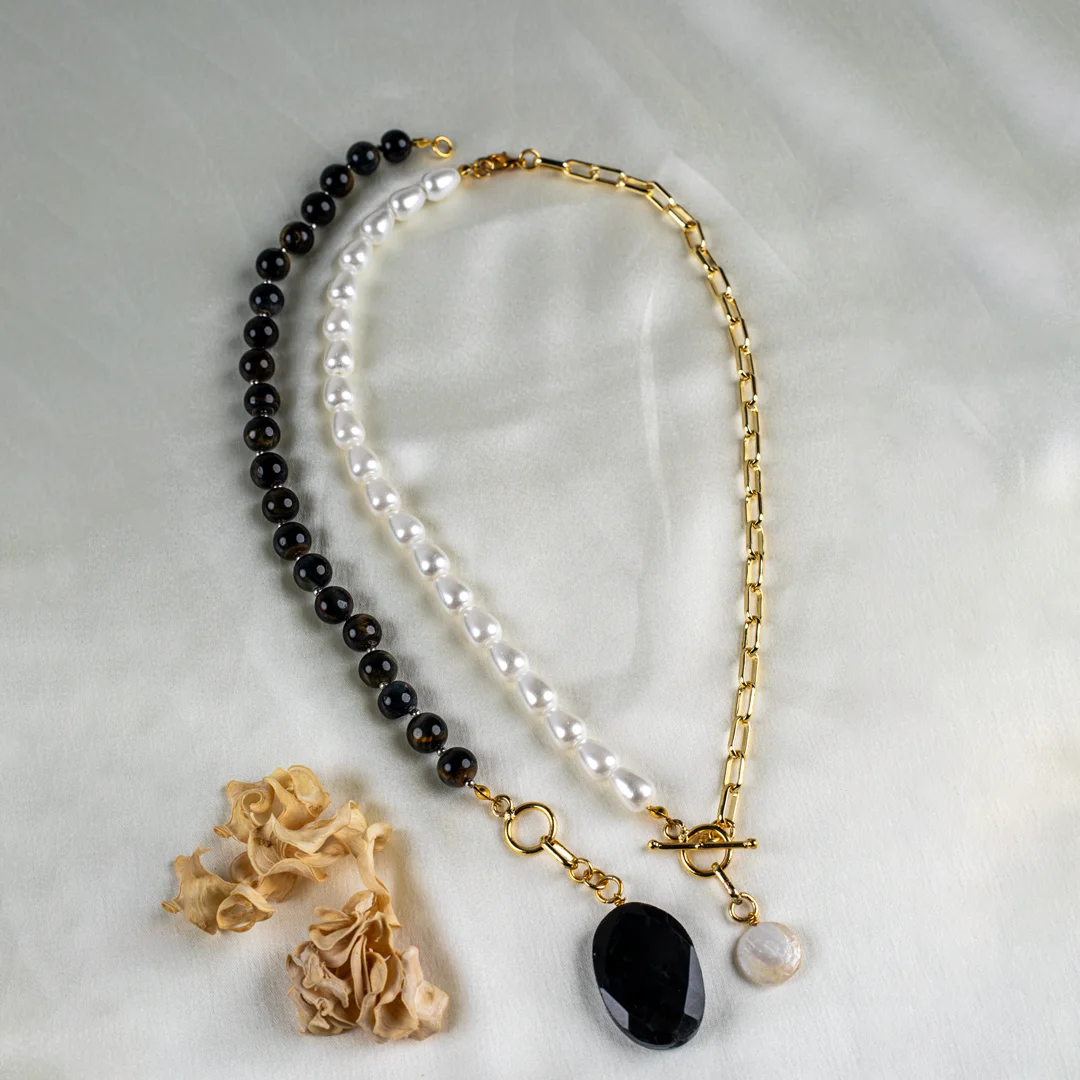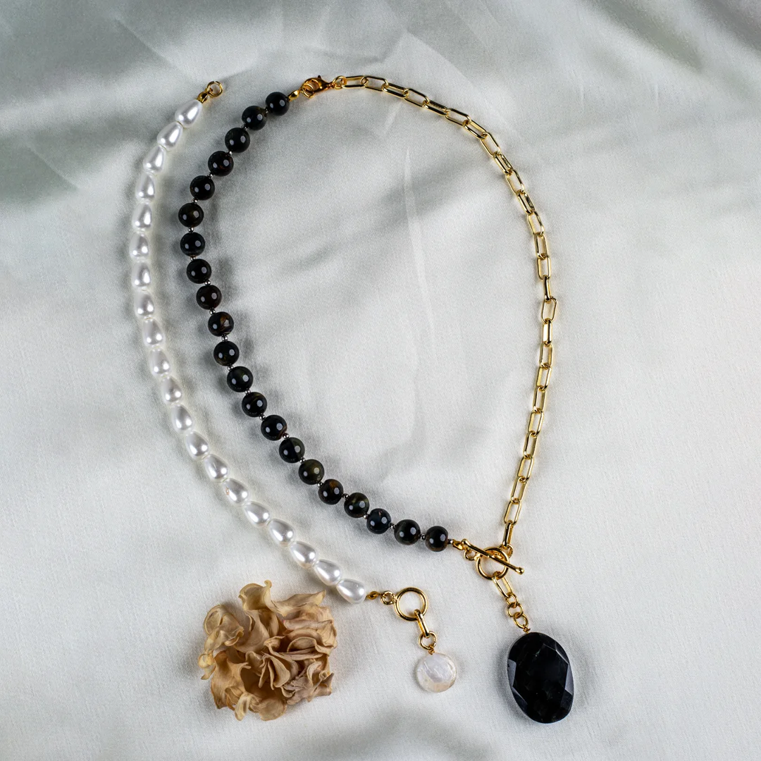 Noiréa is a thoughtfully designed 2-in-1 statement necklace that celebrates versatility through contrast. Crafted with glossy black onyx beads, classic white pearls, and sleek gold-tone chain detailing, this asymmetrical design offers two distinct styling options in one refined piece.