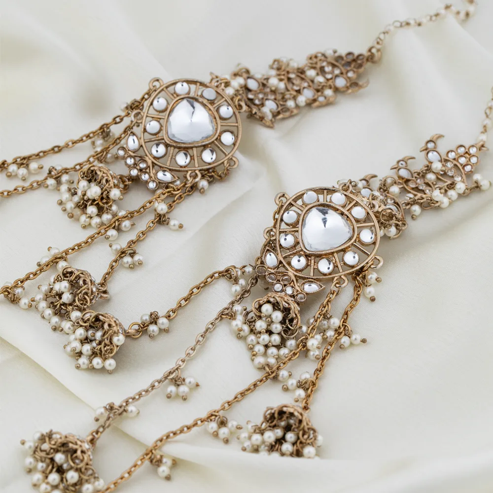Noorjahan is an ode to timeless Mughal elegance, crafted for brides who adore graceful drama. These exquisite sahare feature a regal teardrop kundan centerpiece framed in delicate mirror cut stones, forming a radiant circular motif. The upper segment is adorned with intricate filigree work and soft pearl embellishments, creating a refined vintage charm.