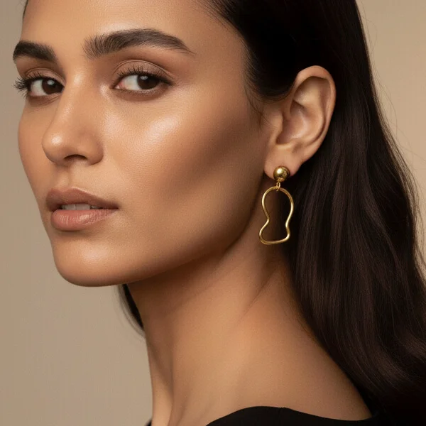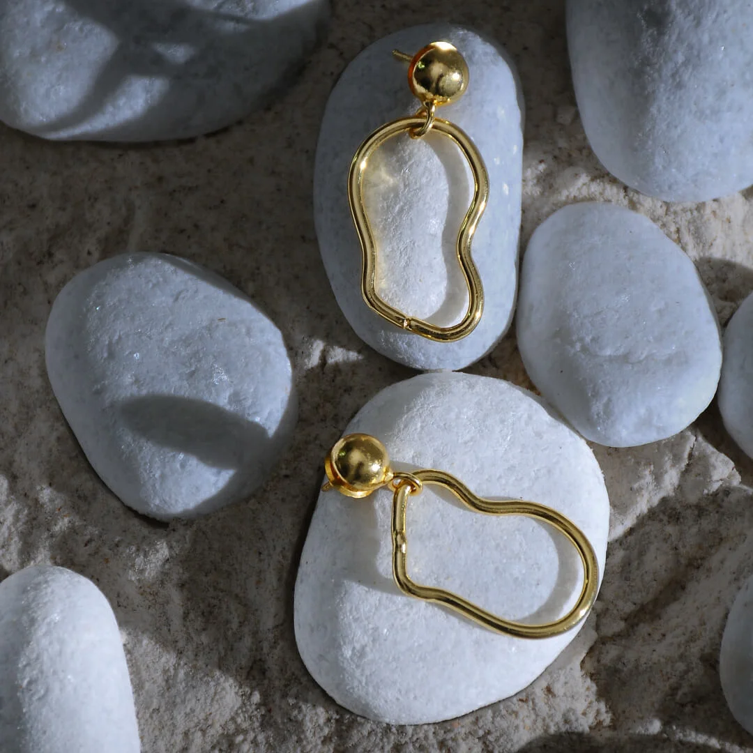 Oro is a tribute to effortless modern design. Crafted in brass and finished with high-shine gold plating, these earrings feature an abstract wavy silhouette anchored by a smooth round stud. The free-form curves bring a soft sculptural edge to any outfit, making them a statement of understated confidence.