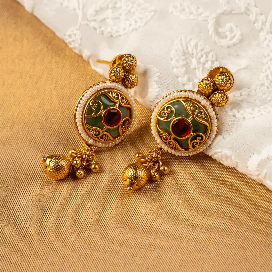 The adjustable traditional thread closure enhances its authentic temple styling, while the matching drop earrings echo the medallion design with ruby center stones and gold bead danglers.