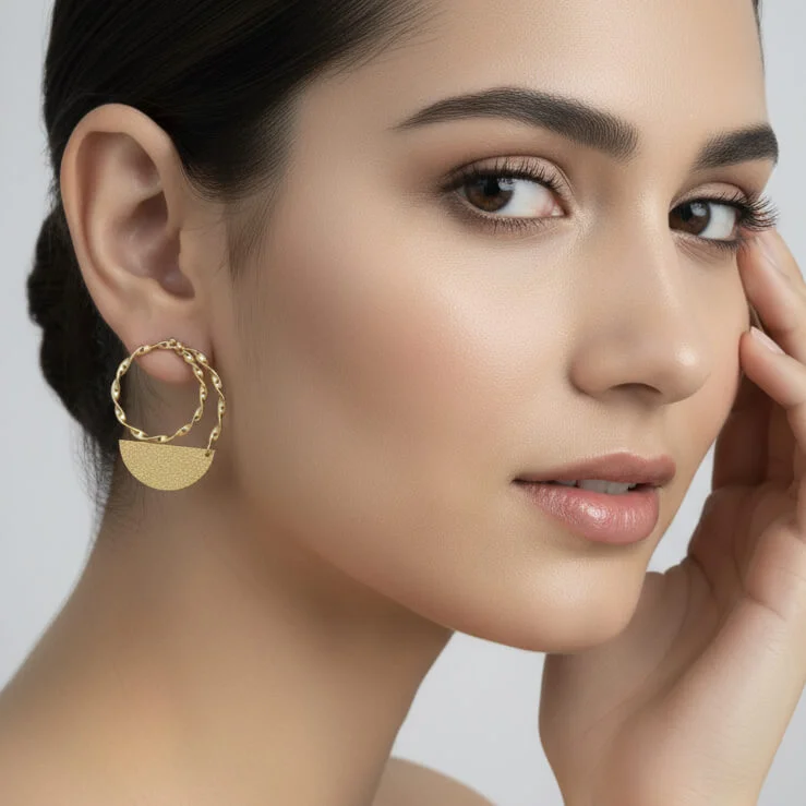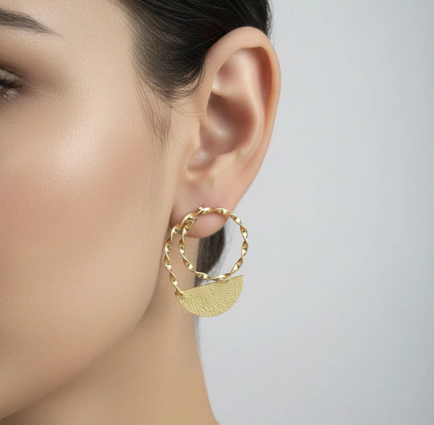 Selene blends modern geometry with a soft handcrafted charm. The design features a twisted open hoop paired with a textured half-moon plate, creating a balanced silhouette that feels both contemporary and artistic. The double-element structure adds depth and movement, catching light beautifully from every angle.