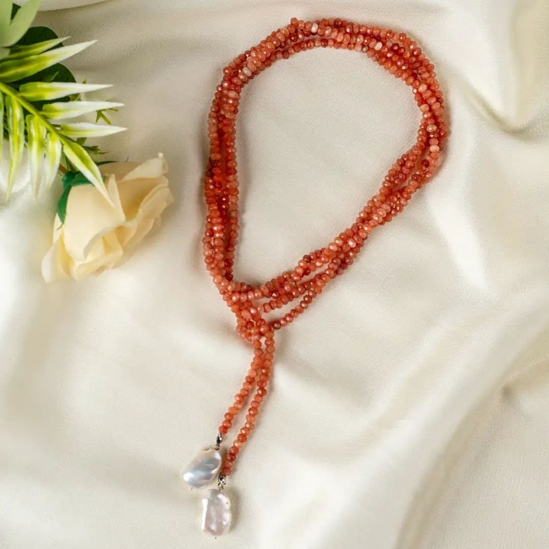 Designed without a clasp, Soléa offers versatile styling—wear it long, looped, knotted, or layered to suit your mood. The subtle shimmer of sunstone catches the light beautifully, while the pearls introduce a refined contrast, creating a harmonious balance between modern minimalism and timeless femininity.