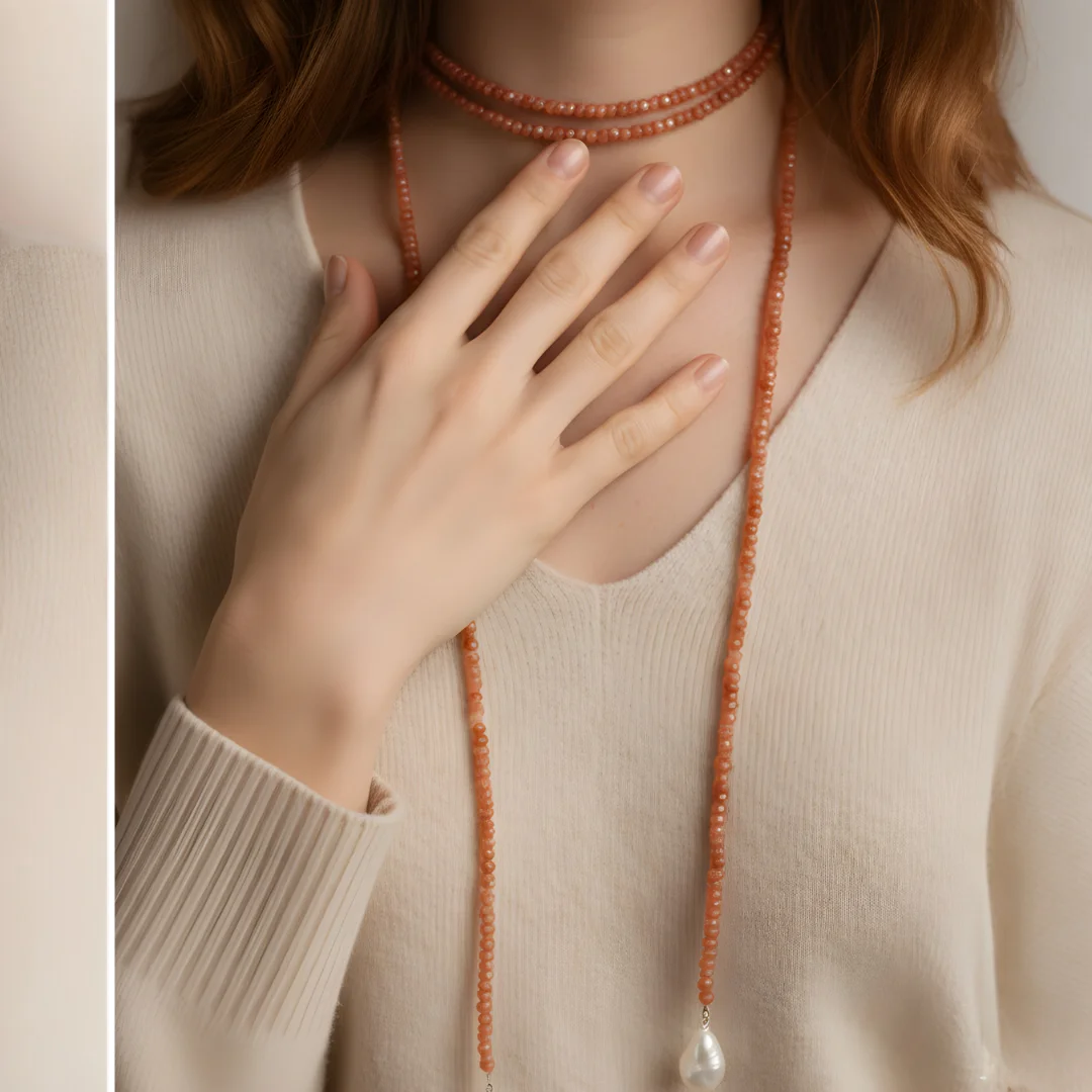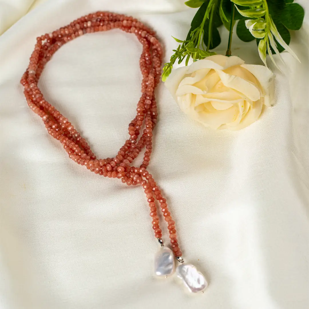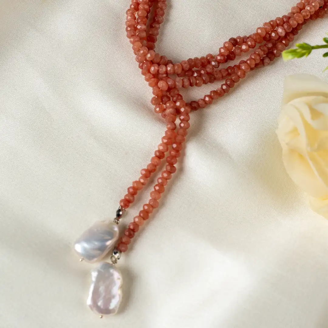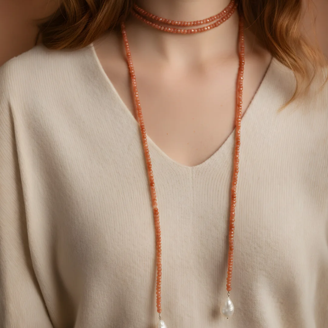 Soléa is a graceful endless necklace that embodies warmth, fluidity, and effortless elegance. Handcrafted with faceted sunstone beads in soft peach hues, this design is finished with delicate natural pearl drops that add organic charm and gentle movement.