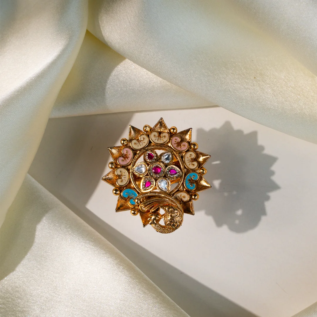 Surmayi is a radiant blend of artistry and heritage, designed in a captivating sunburst silhouette that instantly draws attention. This statement ring features a circular kundan motif at the center, adorned with ruby pink and mirror cut stones arranged in a floral pattern. The surrounding layer showcases soft ivory and turquoise enamel detailing, framed within antique gold triangular rays that create a bold, regal outline.