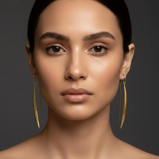 Tara is a tribute to modern grace and timeless allure. These sculpted long drop earrings are crafted in gold-plated brass with a smooth, fluid form inspired by natural curves. Their slender silhouette elongates the neckline beautifully, adding understated glamour to both contemporary and traditional looks.