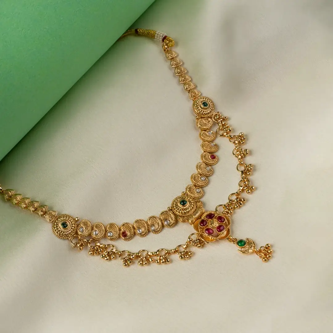 The necklace is beautifully enhanced with layered coin-style elements and delicate ghungroo drops that add graceful movement and a festive charm. The central pendant showcases an ornate floral design highlighted with ruby-toned stones, finished with a crescent motif and bead drops for a regal touch.