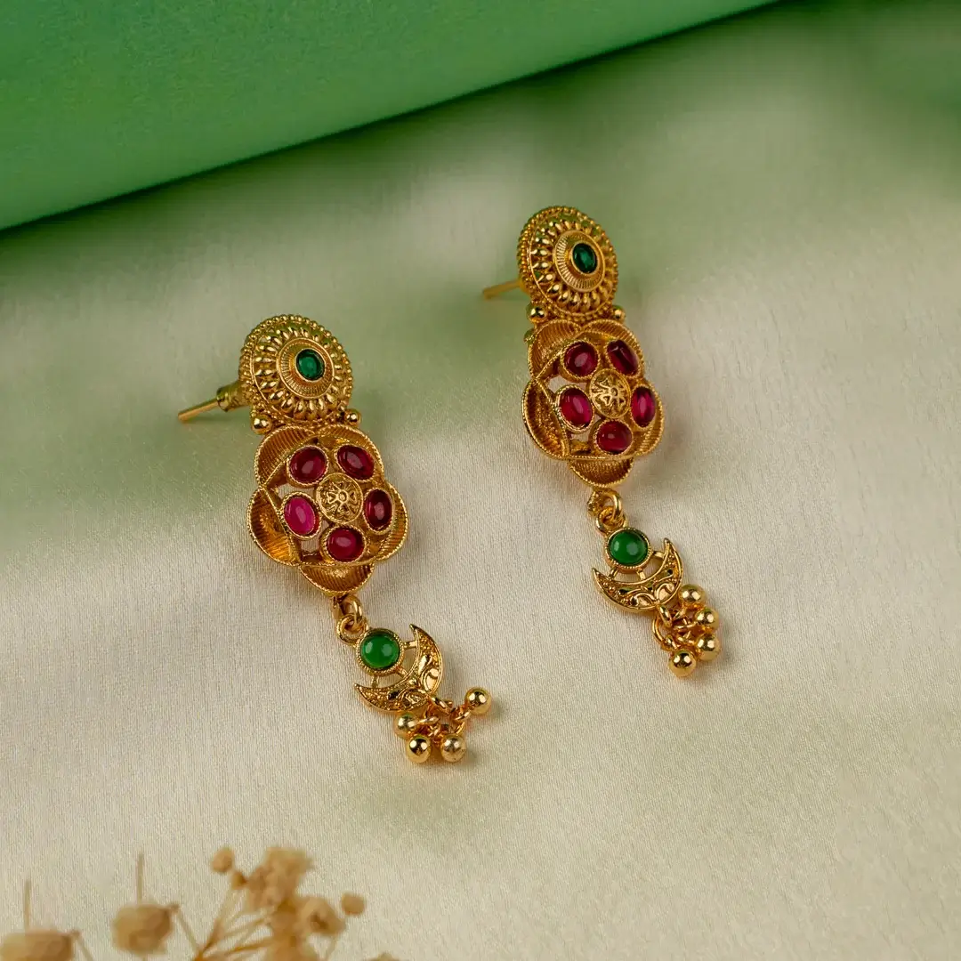 Vaishnavi is a classic temple-inspired necklace set that reflects the richness of South Indian heritage with intricate craftsmanship. Designed in a radiant gold-tone finish, this statement piece features finely detailed circular motifs adorned with deep ruby-red and emerald-green stone accents, creating a harmonious play of colour and tradition.