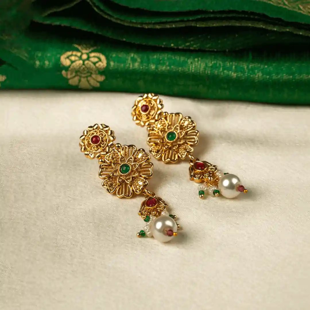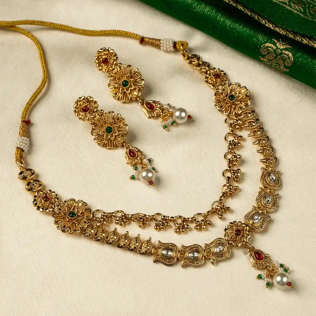 Vaidehi is a vibrant ode to traditional Indian craftsmanship, blending floral artistry with classic paisley elegance. This necklace features intricately carved flower motifs adorned with ruby red and emerald green stone accents at the center, creating a striking festive contrast. The neckline flows into a rhythmic sequence of paisley shaped kundan style elements set with clear stones, adding brilliance and heritage charm. Delicate gold bead clusters and tiny pearl drops sway gently along the lower edge, enhancing movement and celebratory richness. The matching earrings mirror the floral motif design, finished with pearl danglers accented with subtle green and red bead details, bringing harmony and balance to the set.