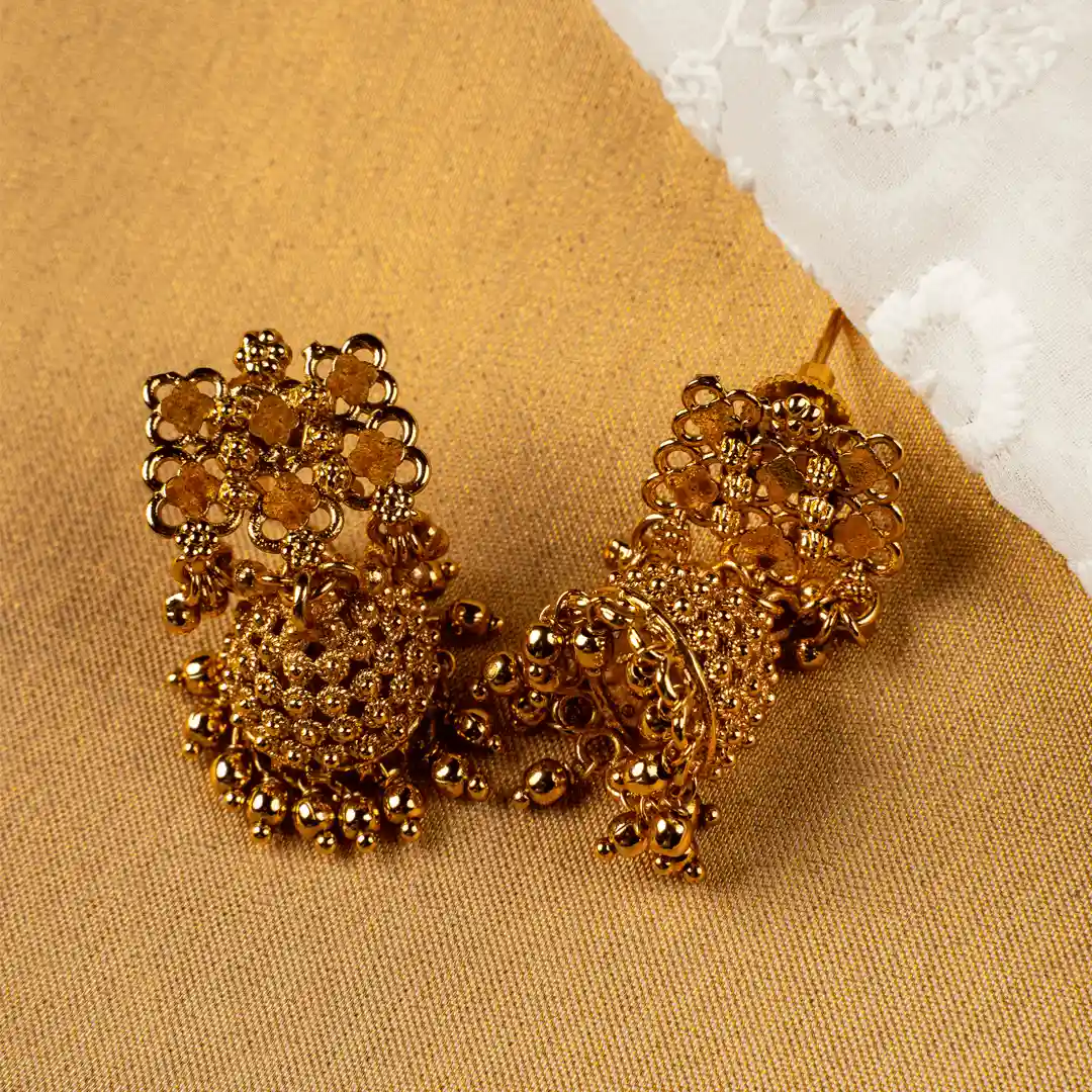 Varnika is a regal celebration of intricate metal artistry crafted in a rich antique gold finish. This statement choker features a dense floral jaal pattern, where delicately sculpted flower motifs interlace to create a textured, heritage inspired silhouette. The curved neckline sits gracefully, finished with layers of tiny gold bead danglers that add fluid movement and a soft festive rhythm. The side cords are highlighted with pearl bead accents, enhancing its traditional charm while offering an adjustable fit. The matching jhumka earrings echo the same floral craftsmanship, featuring detailed tops and dome shaped jhumkas finished with cascading gold beads for a cohesive and grand look.