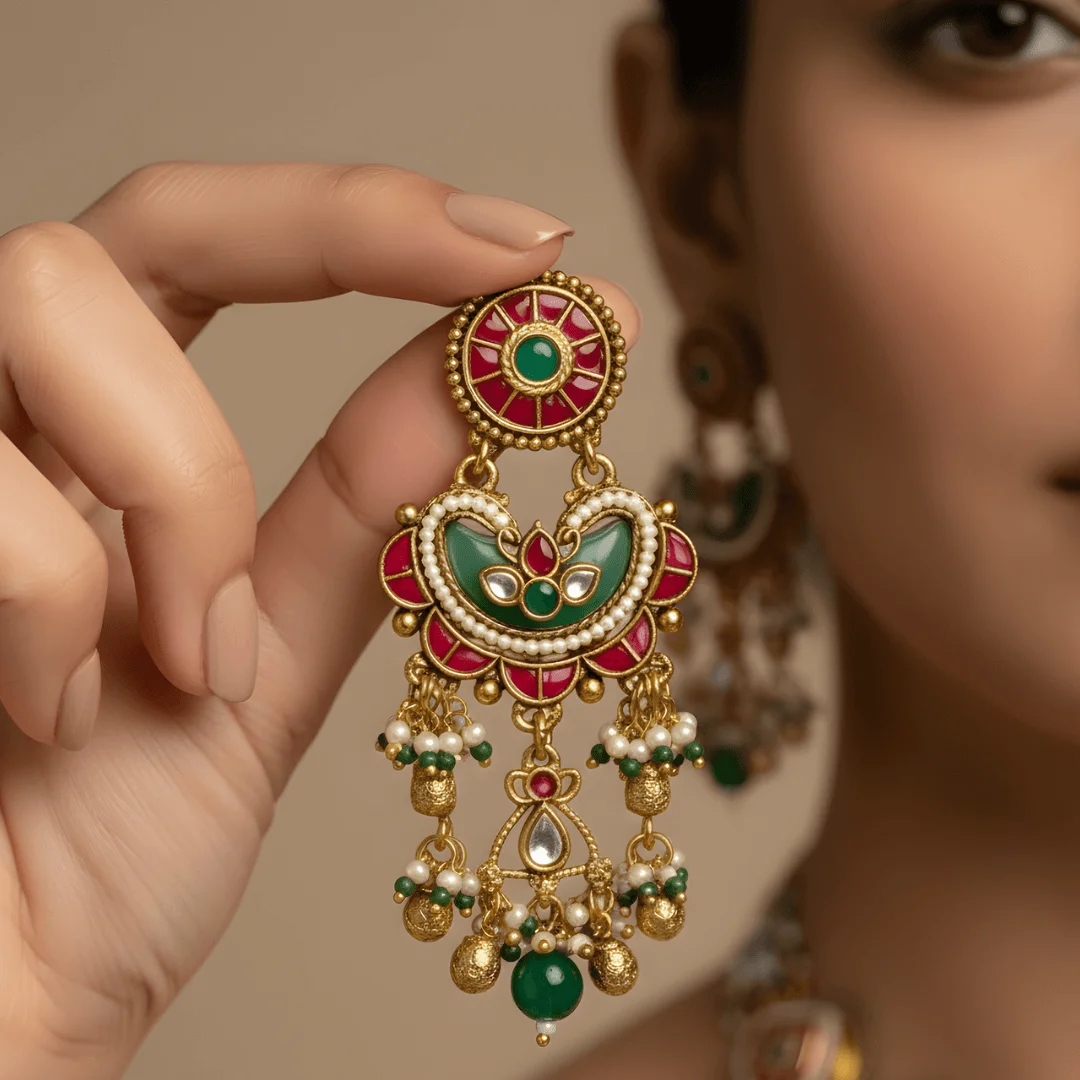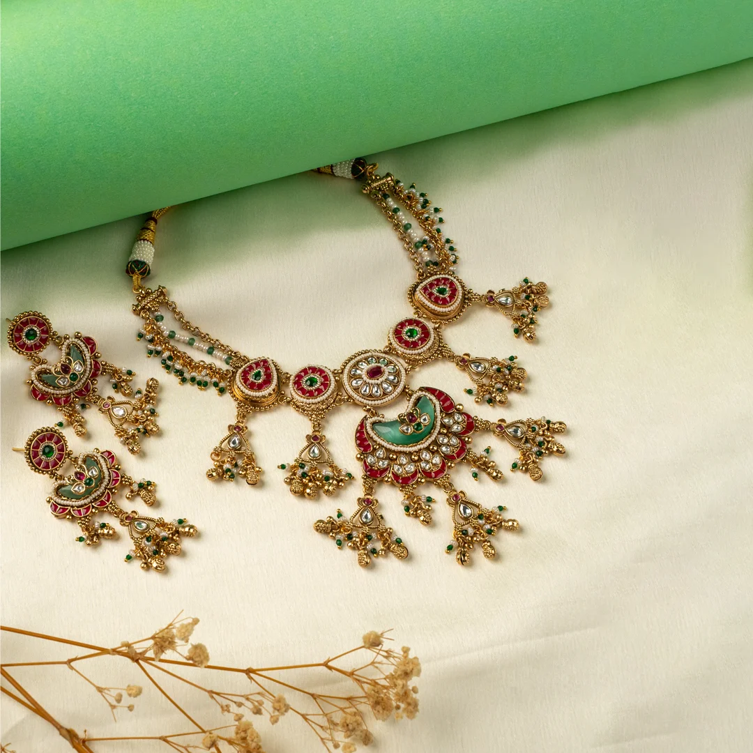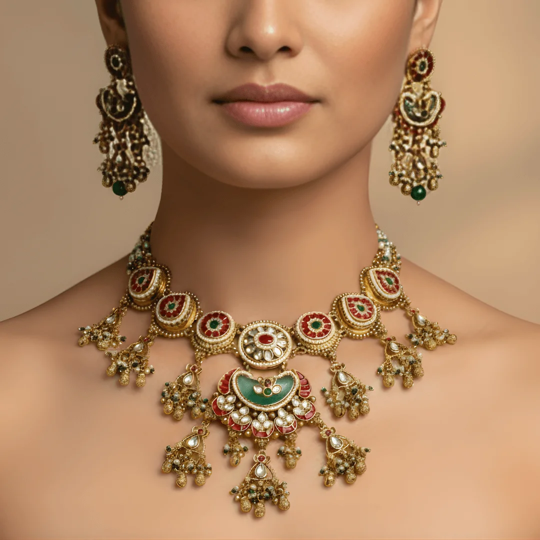 Yashodhara is a radiant blend of royal meenakari artistry and classic kundan elegance, designed to capture the essence of traditional grandeur. This statement necklace features a striking crescent inspired centerpiece in rich red and emerald green enamel, framed with intricate gold beading and shimmering kundan style stones. The upper neckline is adorned with circular red meenakari motifs set with green stone centers, connected through layered gold chains accented with tiny green bead clusters for added texture and movement. Delicate jhumki style danglers cascade from each element, finished with pearl and green bead accents that bring festive rhythm and depth to the design. The matching earrings mirror the crescent motif, layered with meenakari detailing, kundan stones, and ornate danglers that complete the regal silhouette.